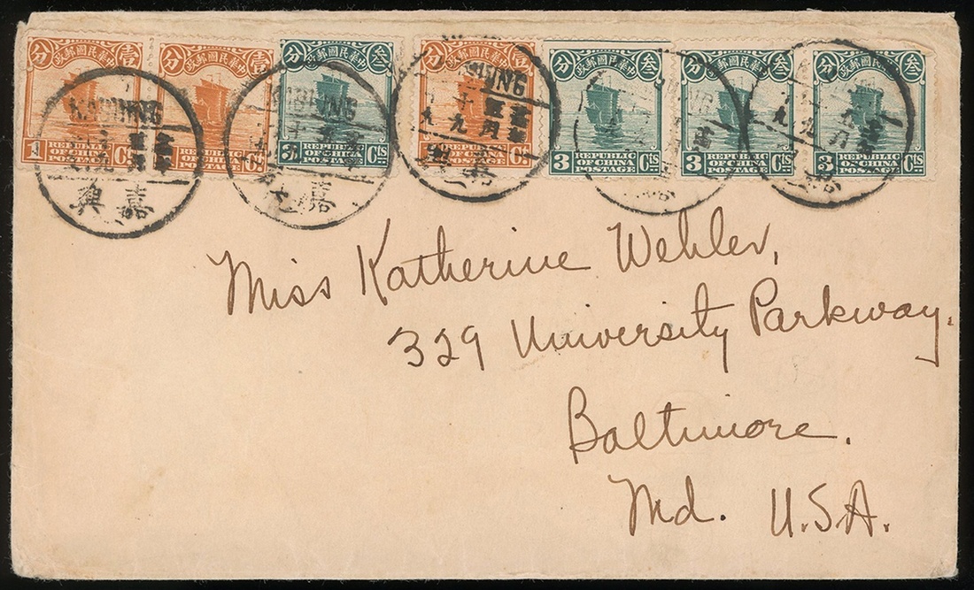 1926 (19 May) China envelope to Baltimore, U.S.A. franked with $0.15 Junk stamps tied by Kashing c.d.s.