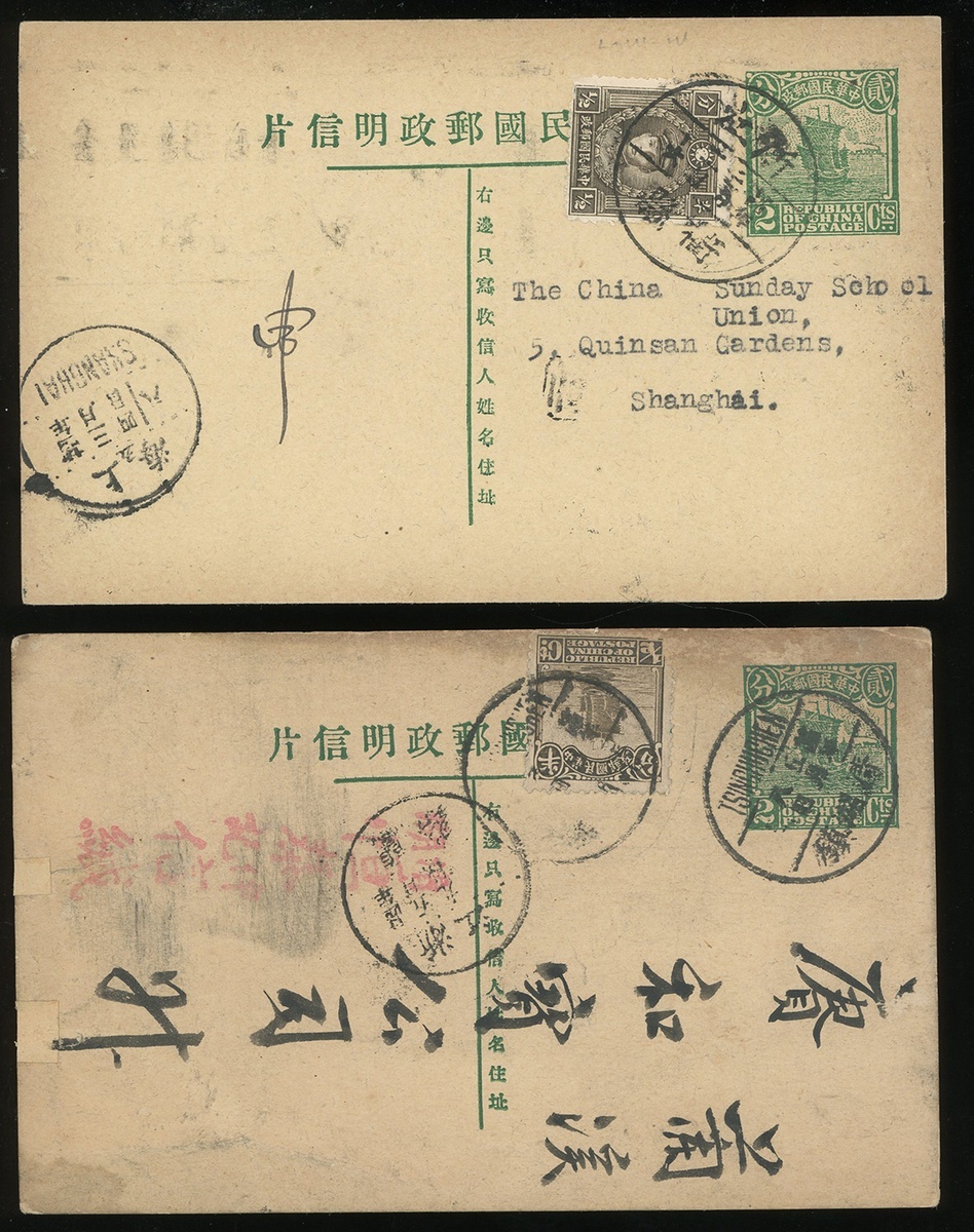 1935年實寄第七版帆船2分郵資片2件,分別加貼北京二版帆船半分及京版烈士半分1枚,銷分別為浙江衢縣3月2日寄上海,浙江清湖鎮5月8日寄蘭溪,均郵戳清晰,保存完好