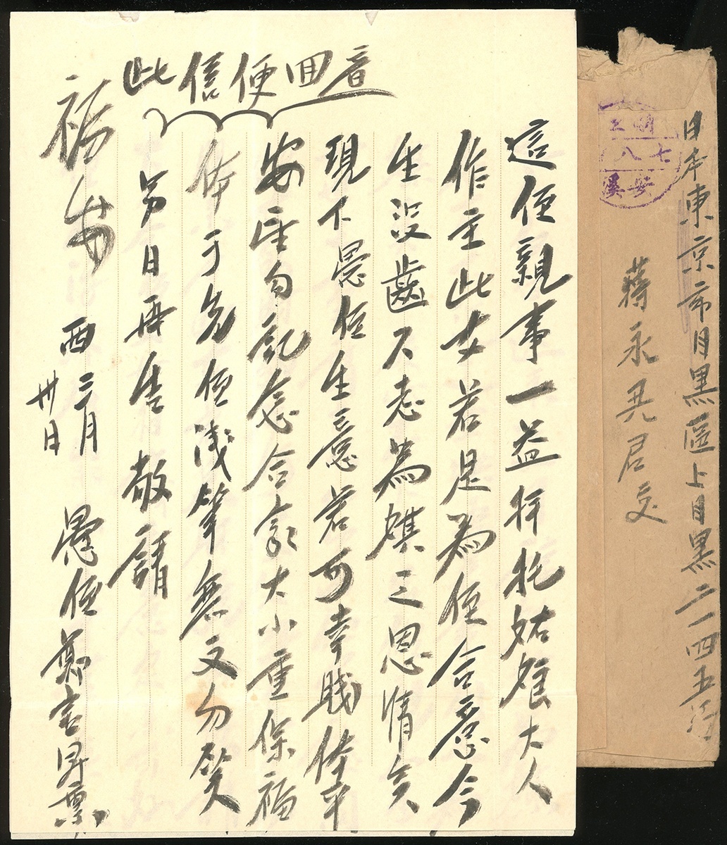 1935 (3 Mar.) a cover with content from Japan to Wenchow, blue Chekiang letter box alongside.