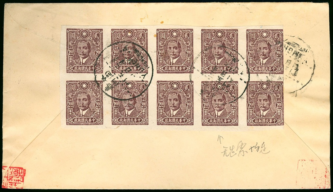 1946 (5 Mar.) a cover to Shanghai bearing Dr S.Y.S. Issue Paicheng Print $2 in block of ten, imperf., tied by Yungkia c.d.s. Rare use of Paicheng imperf. stamps on cover, fine.