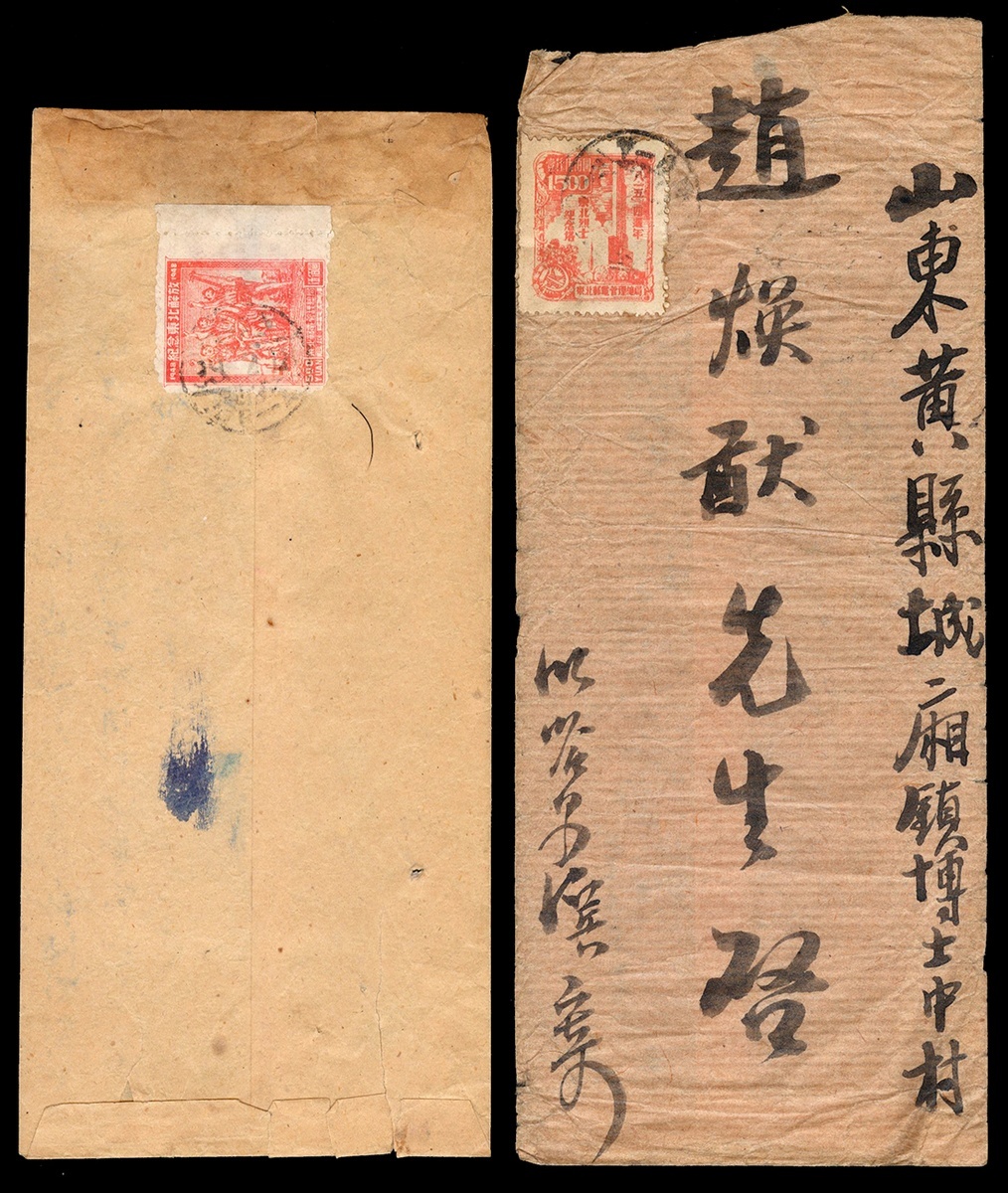 1949 two covers from North East Liberated Area with Commemorative issue , bearing, $500 and $1500 with different arrival c.d.s., included one Chefoo transit c.d.s. please review.