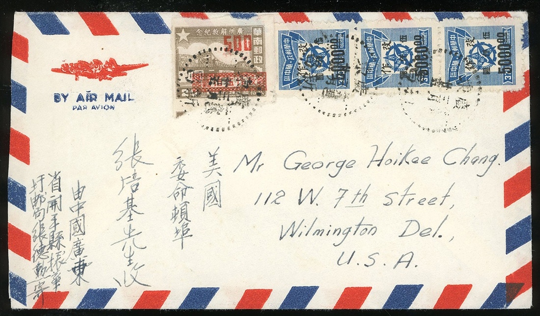1950年廣東新昌寄美國航空封1件,貼華南解放區廣東解放加蓋500元2枚,華中區五星圖加蓋改值5000元3枚,銷廣東新昌3月25日戳,郵戳清晰,保存完好