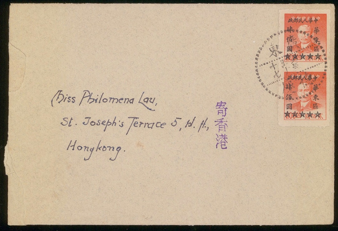 1950 (17 May) cover from Takhing to Hong Kong, bearing Dr.Sun overprinted with a pair of "East China Area Chinese People's Post" and Surcharged $400 on $200, tied by Takhing c.d.s.