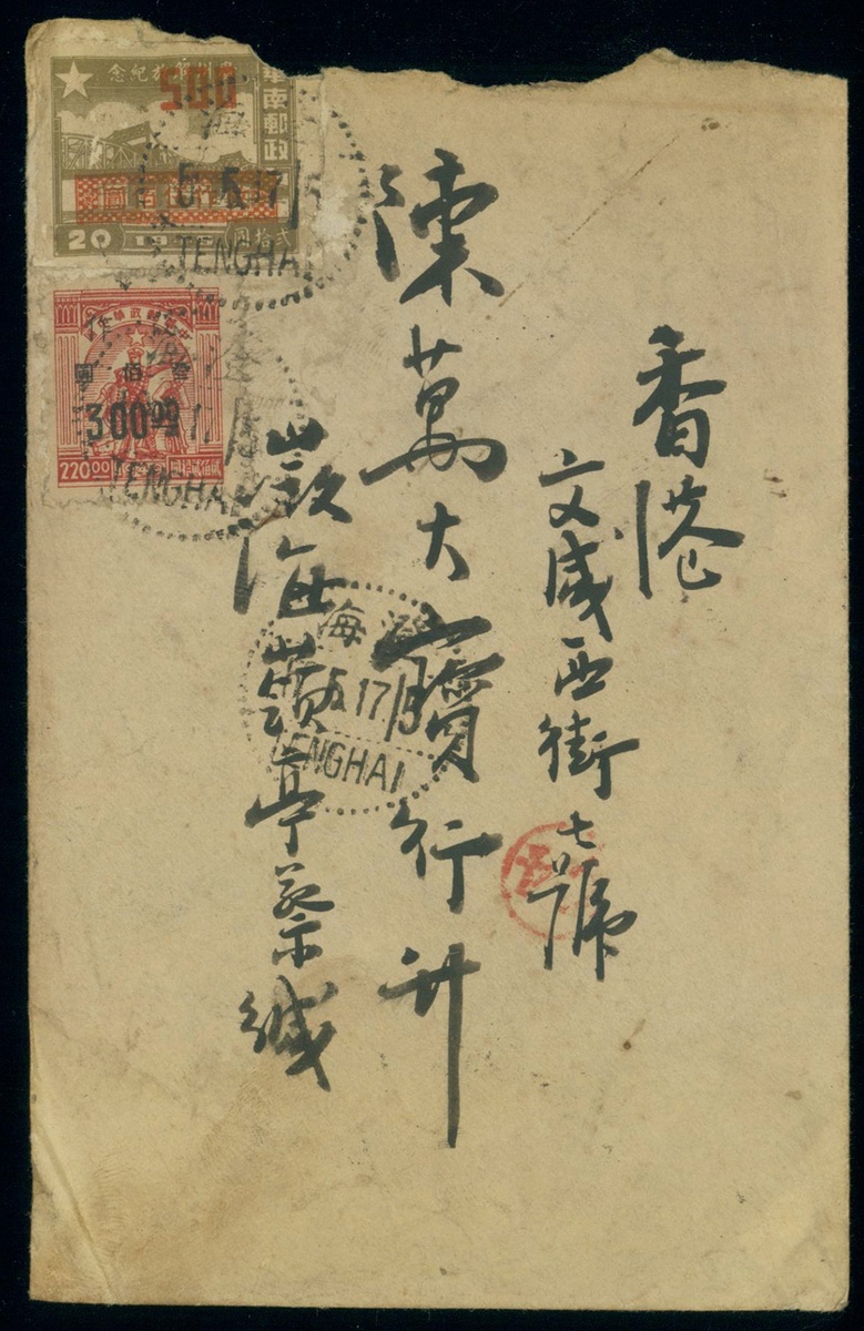 1950年廣東澄海寄香港實寄封1件,貼華南解放區廣州解放加蓋500元1枚,華中解放區工農兵圖加蓋改作300元1枚,銷澄海5月17日戳,有汕頭同日機蓋中轉戳,保存完好