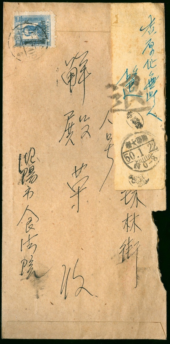 Northeast Cnina Local Posts: 1950 (21 Jan.) Shenyang to local return cover, bearing Northeast Liberated Area Mao surch. $2,500 on $ 6.500, tied by Shenyang c.d.s., on the reverse, with return lable and c.d.s. (22.1), return arrival c.d.s. (24.1) on the address side.