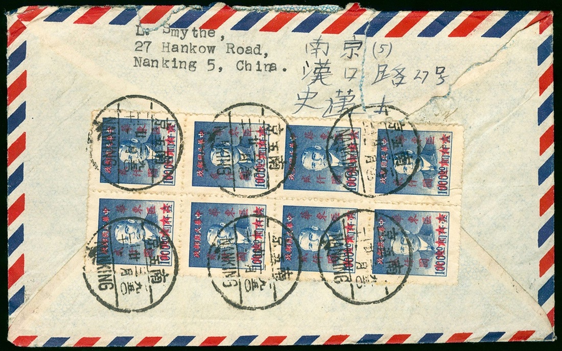1950 (21 Mar.) to USA air mail cover, on the reverse, bearing Dr.Sun overprinted with "East China Area Chinese People's Post" and surch.$2,000 on $1,000 block of 8 tied by Nanking c.d.s.