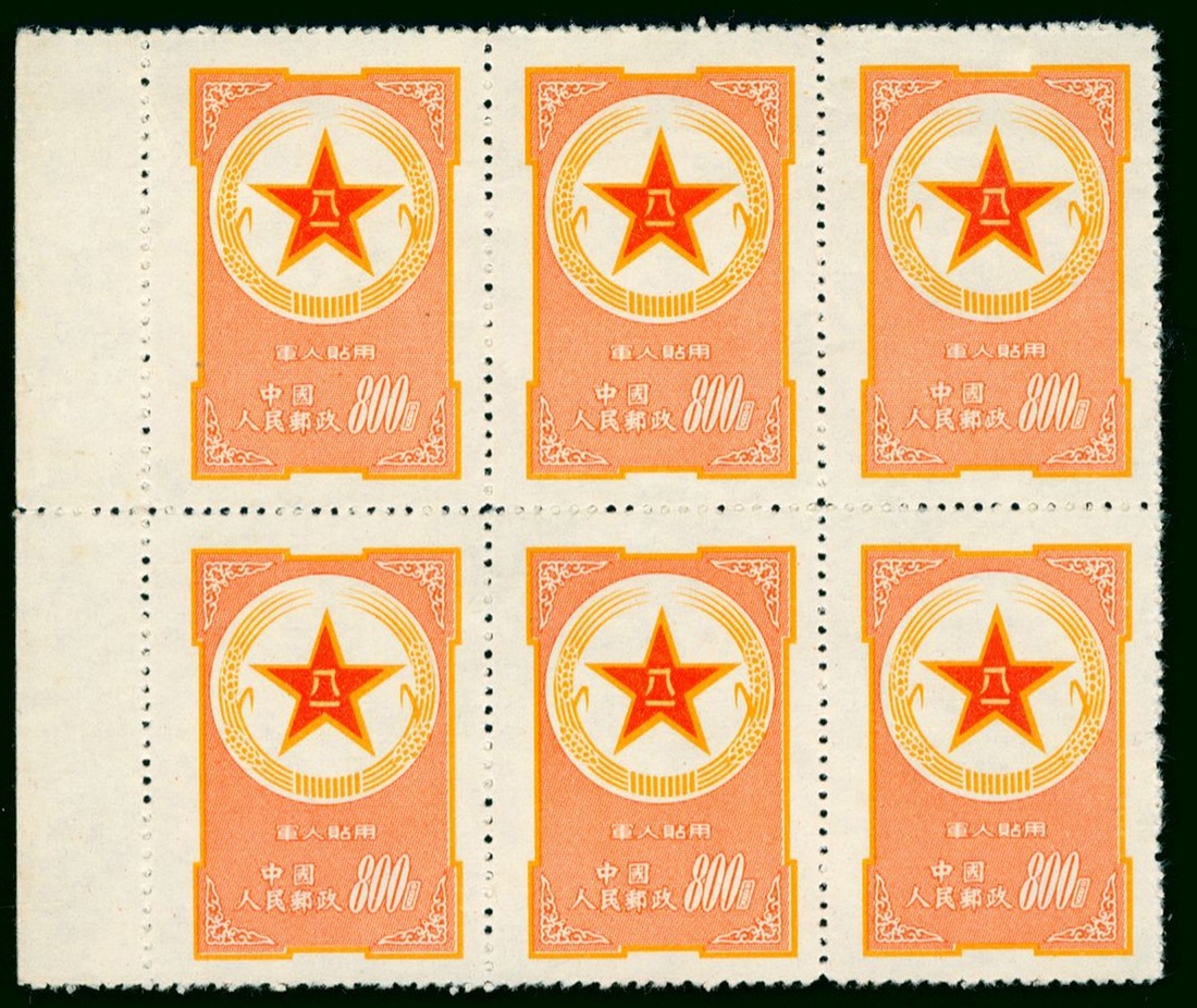 1953年黃軍郵新票六方連1件,帶左邊紙,顏色鮮豔,齒孔完整,上中品