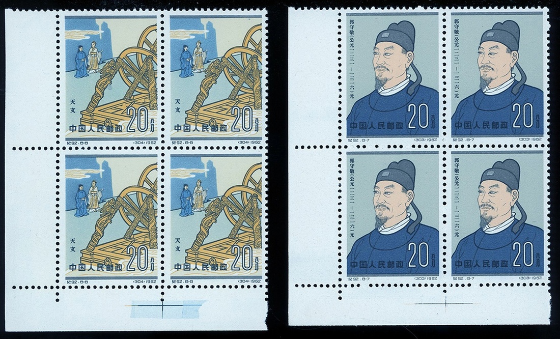 1962 Scientists of Ancient China, 2nd series (C92) complete set of eight in left lower cormer block of four with margin, lower margin with " + " mark, unmounted mint. Yang C297-304