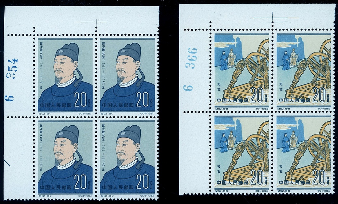 1962年紀92古代科學家二組新票四方連1套,均帶左上直角邊紙,顏色鮮豔,原膠,上中品