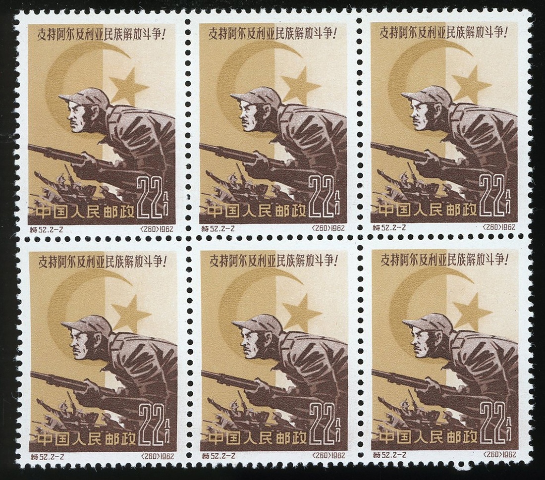 1962 Support for Algeria (S52) 8f. and 22f. set of two in block of six, 8f. with upper margin, unmounted mint, very fresh. Yang S259-260