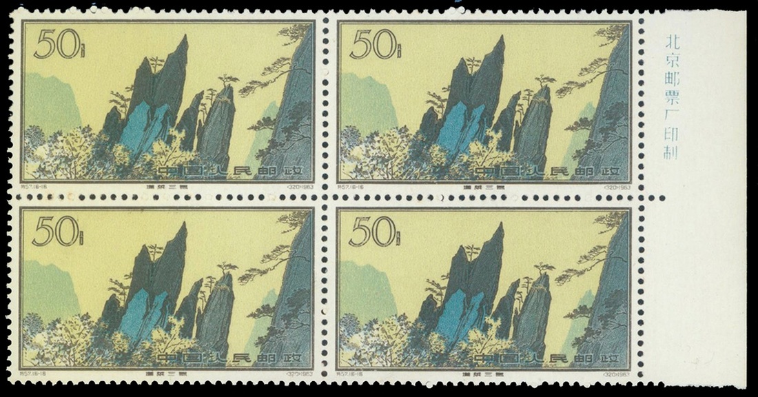 1963年特57黃山新票四方連1套,均帶廠銘邊紙,正面顏色鮮豔,背膠白潤,個別有輕微黃點,較色基本一致,總體上中品,非常少見