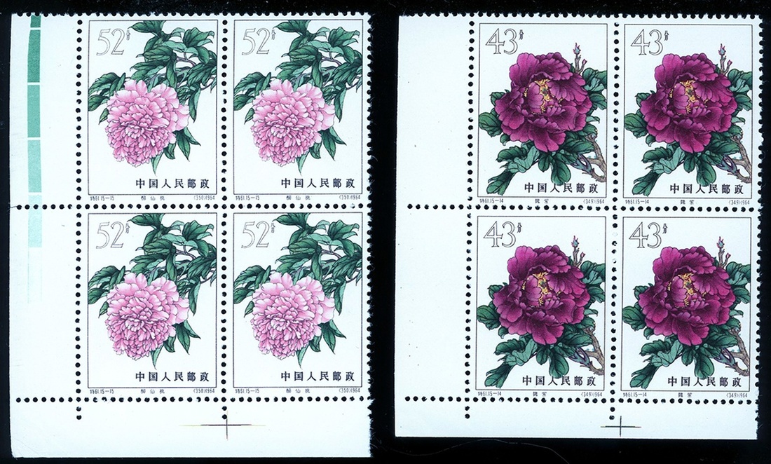 1964 Chinese Peonies (S61) complete set of 15 in left lower corner block of four with margin, some block with color code, unmounted mint. Yang S336-350