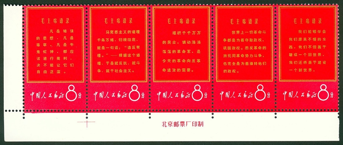 1967 (W1) Long Live Invincible Chairman Mao's Thought, 8f in se-tenant stripe of five with lower imprint and left margin, fine, unused. Yang W7-11