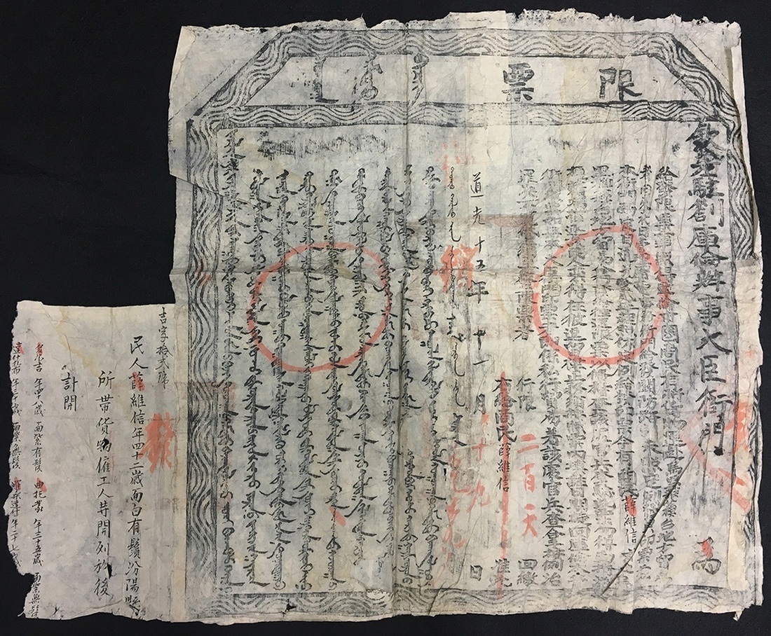Qing dynasty 1836. From Script with stamp to go through relay station or protect issued by the high official minister of Qing dynasty.
