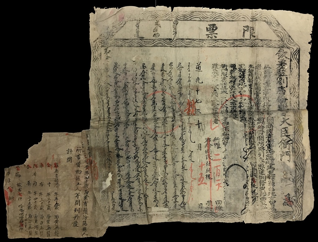光緒十七年(1837年)欽差駐紮庫倫辦事大臣衙門限票1件,右側局部經修補,整體保存完好
