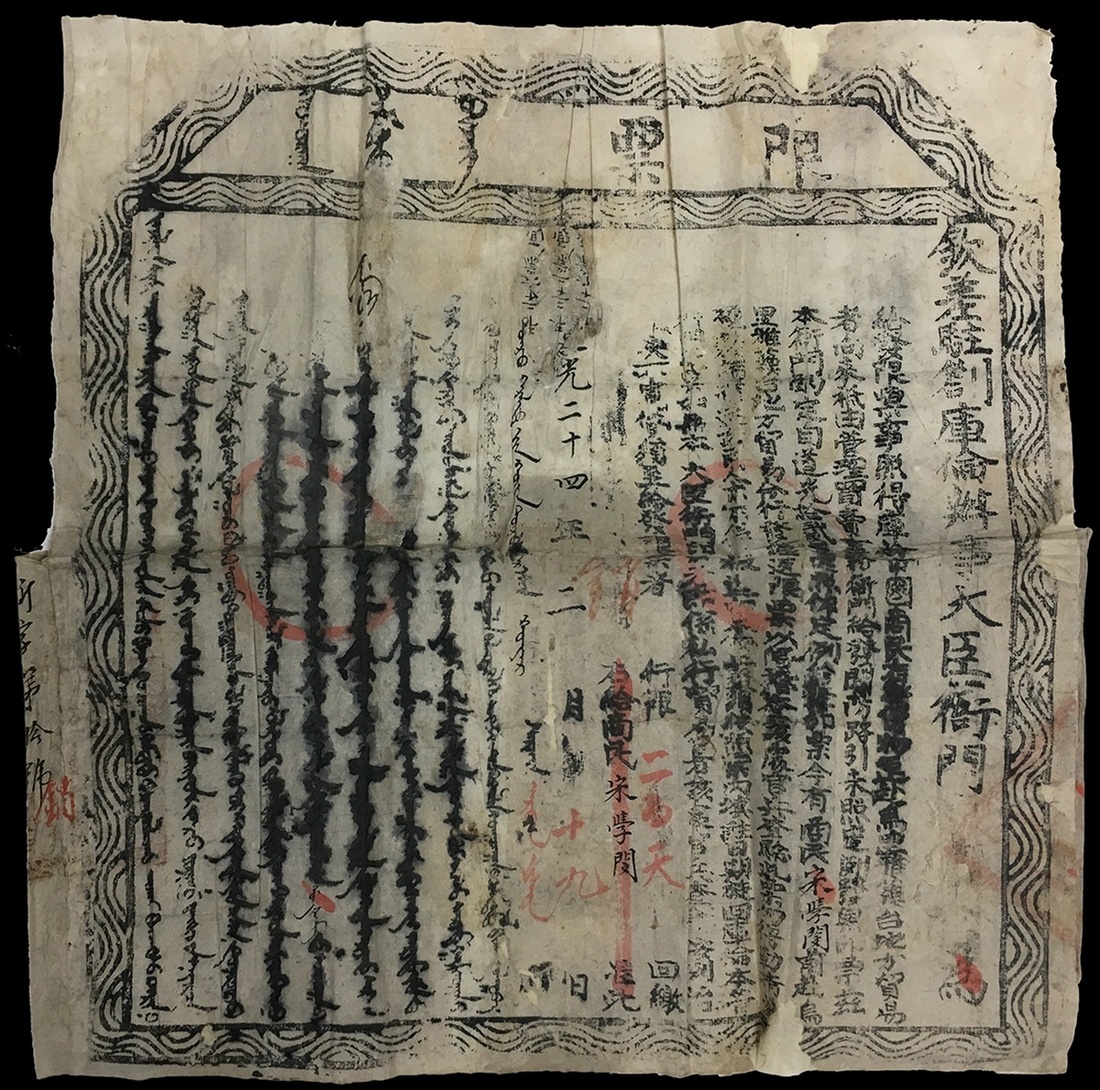 光緒二十四年(1844年)欽差駐紮庫倫辦事大臣衙門限票1件,上邊局部經修補,整體保存完好