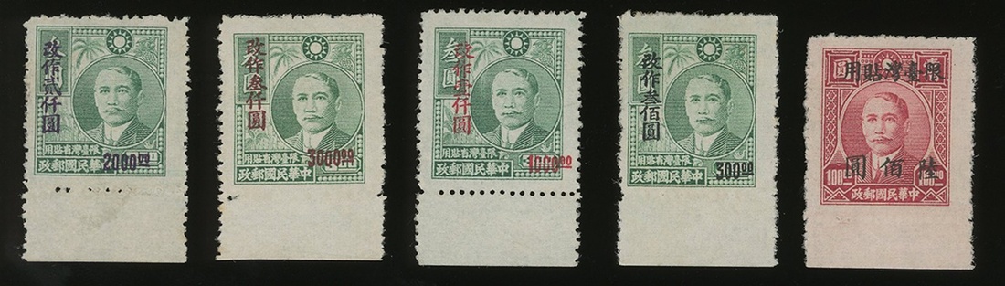 1948-49年孫像加蓋臺灣貼用新票5枚,包括上海大東一版孫像加蓋限臺灣貼用600元1枚,臺灣一版農作物圖孫像3元加蓋300元,1000元,2000元,3000元各一枚,均帶底邊紙,品相佳,為整套票中關鍵郵票,市場價值高
