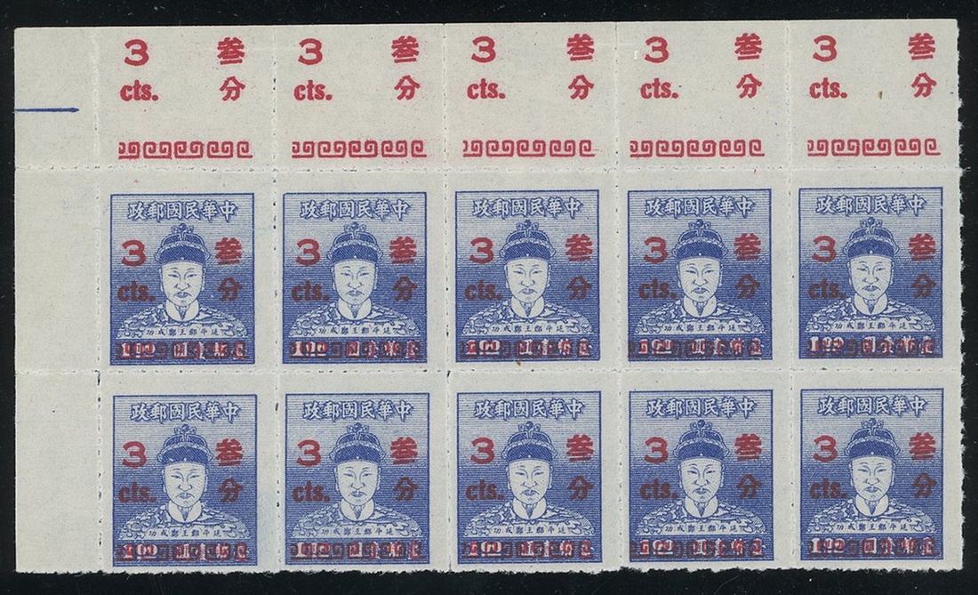 1953 Koxinga surch. 3c. on $1 left corner block of ten, surcharge also overprinted on margin variety, unused, very fresh. SG157v.