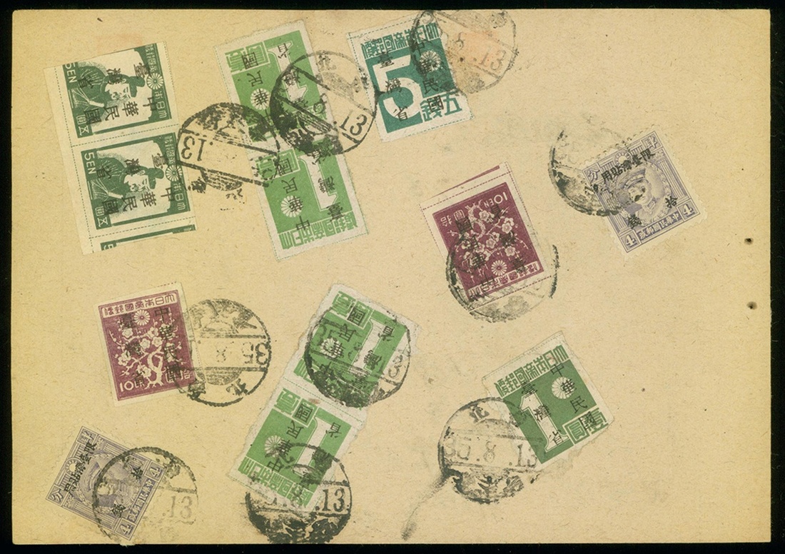 1946年臺灣郵資總付單1件,貼日本加蓋中華民國臺灣省郵票5錢1枚,1元5枚(原票刷色明顯不同),5元橫雙連,10元2枚(原票刷色不同),;烈士加蓋限臺灣貼用10錢2枚,銷臺灣省臺北8月13日戳,保存完好,日本數位加蓋臺灣省郵票高值使用少見