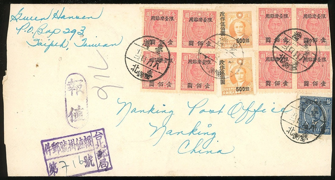 1949 (1 Feb.) an insure registered cover to Nanking bearing $1810 franking tied by Taipeh c.d.s. and ‘insure registered’ handstamp alongside.
