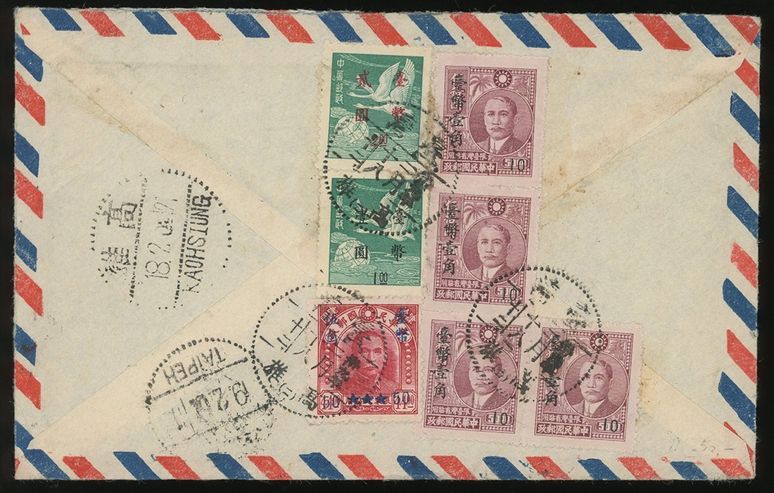 1949-50年臺灣寄海外航空封3件,分別貼北平中央版孫像加蓋台幣,飛雁圖第一次加蓋台幣等郵票,銷高雄,新莊等郵戳,整體郵戳清晰,保存完整,請預覽