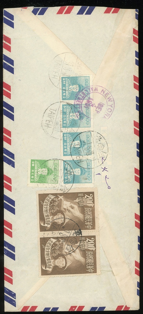 1951 (31 Aug.) a registered air mail cover to USA bearing $24.20 tied by Taipeh c.d.s.