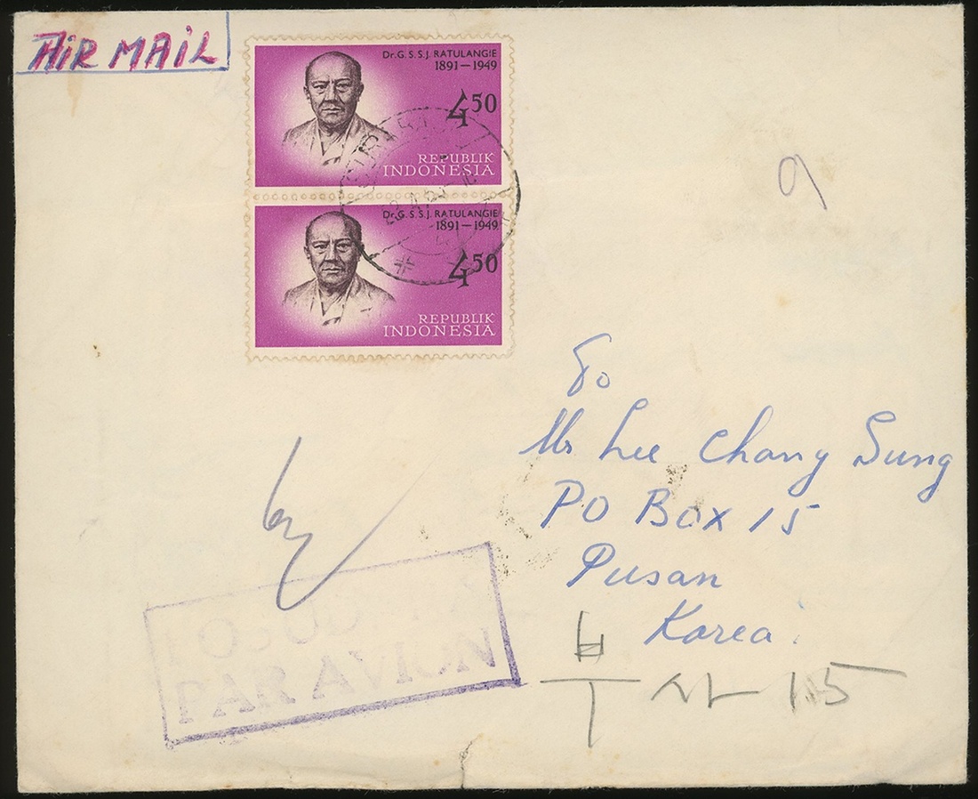 1963 (23 Apr.) an air mail cover from Indonesia to Korea via Taipei (26.4.).
