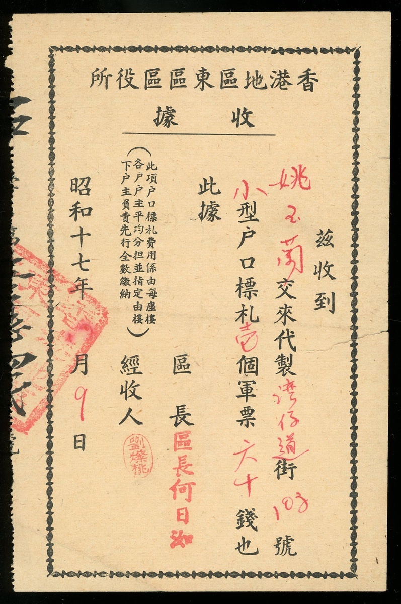 1942 receipt in military currency of manufacturing fee for household signage under Japanese occupation,