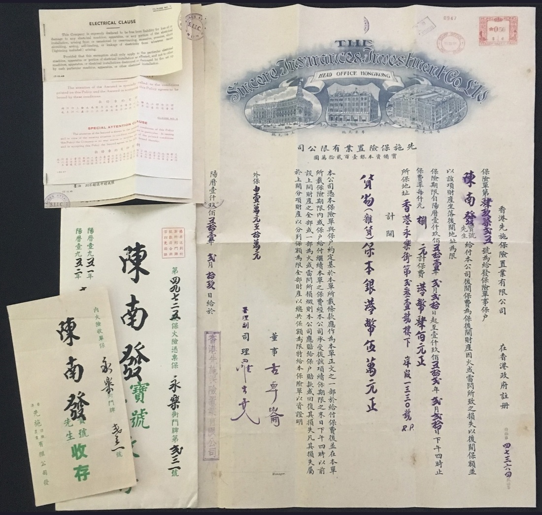 1952 Full set Insurance document with original envelope of Hong Kong Sincere Insurance and Investment co., Ltd. Good condition.