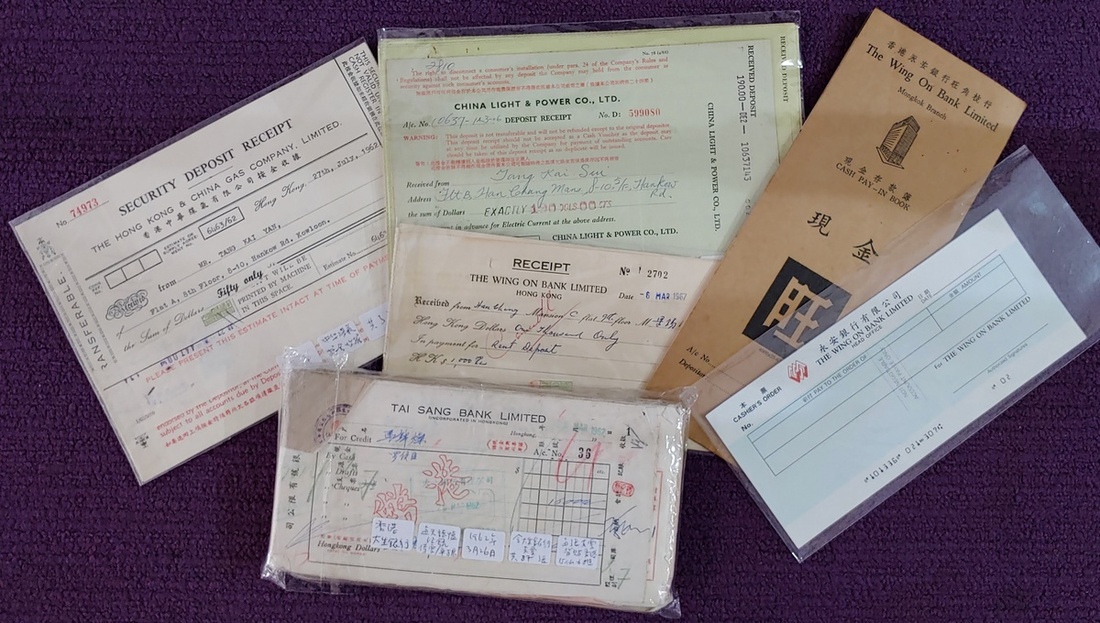 1960s over 100 pieces of old Hong Kong's (Tai Sang Bank, The Wing On Bank) Bank receipts, bills of exchange, checks, certificates of deposit etc.