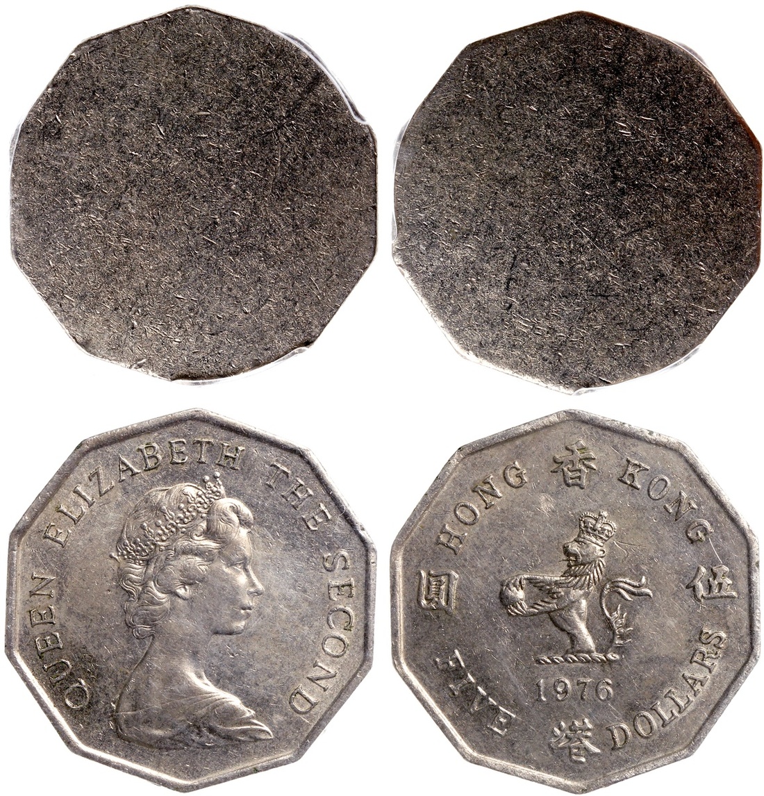 Hong Kong, a pair of copper nickel $5, 1976-79 and 1976, the first one MINT ERROR, Blank Planchet - Type I,