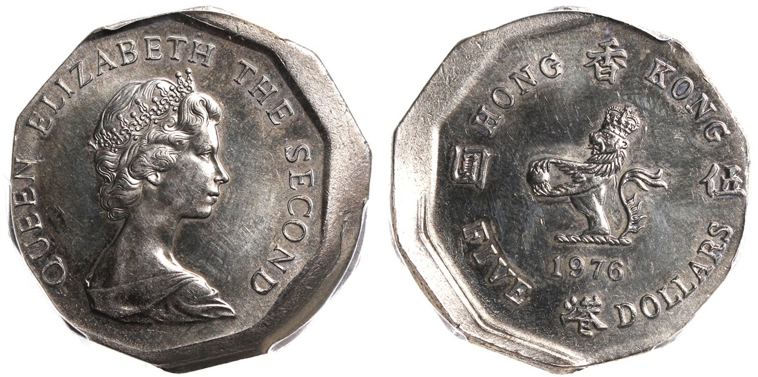 Hong Kong, cupro nickel $5, ERROR COIN, 1976, struck 10% off centre,