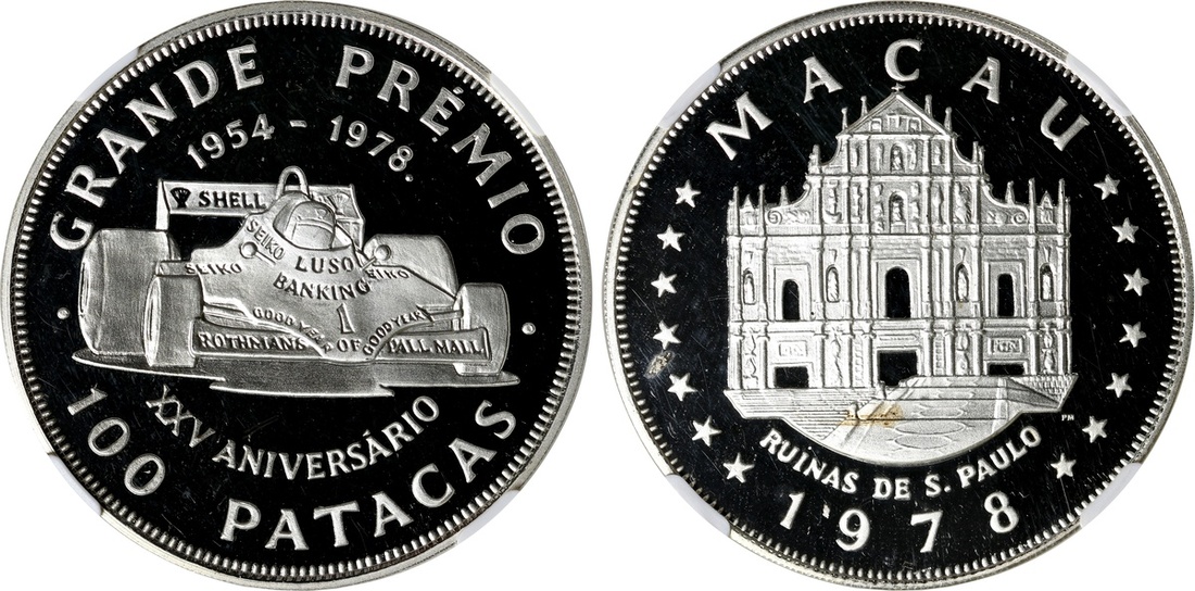 Macau, silver 100 Patacas proof, 1978, WITH ADVERTISING ON CAR, issued for the 25th anniversary of the Macau Grand Prix,
