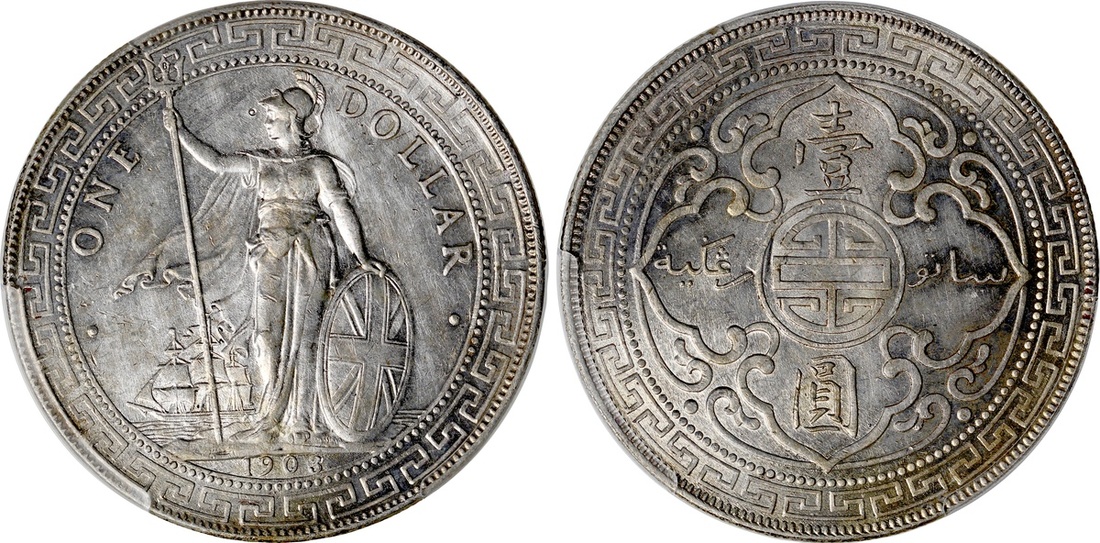 Great Britain, silver trade dollar, 1903/2-B, PCGS AU Detail (Chop Mark). A scarce overdate type