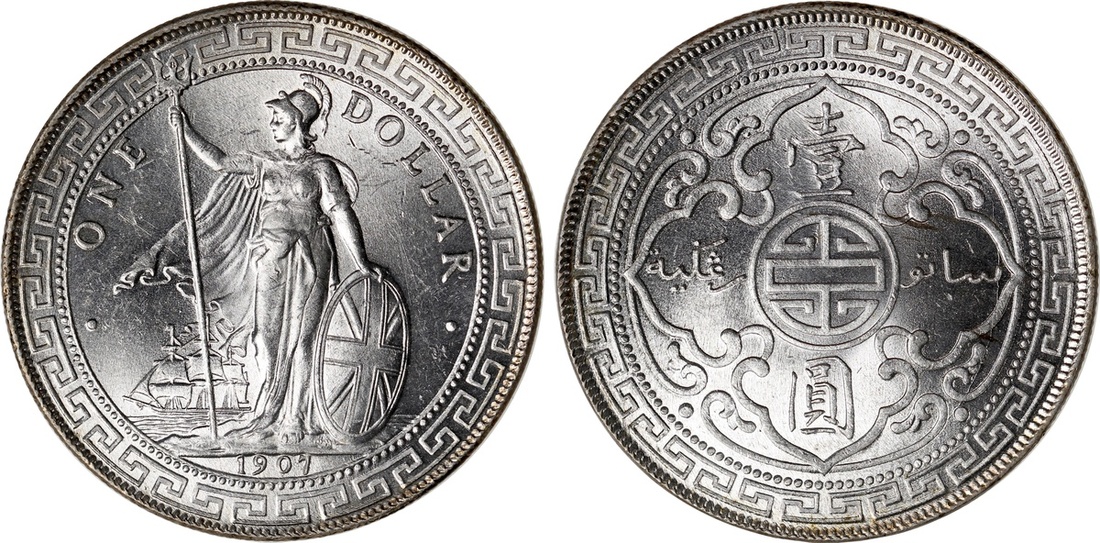 Great Britain, silver Trade dollar, 1907B, with full luster, uncirculated.