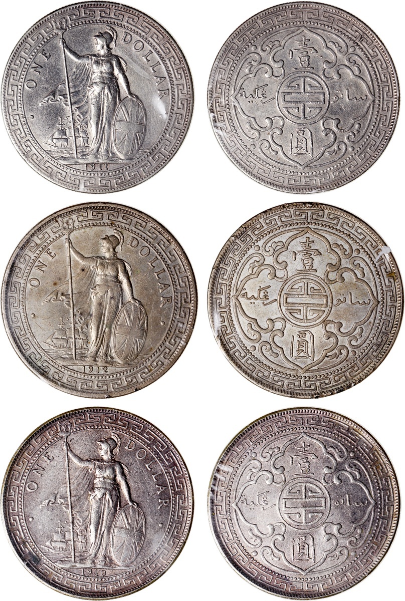 Great Britain, group of 3x silver trade $1, 1910B, 1911B, 1912B, extremely fine (3)