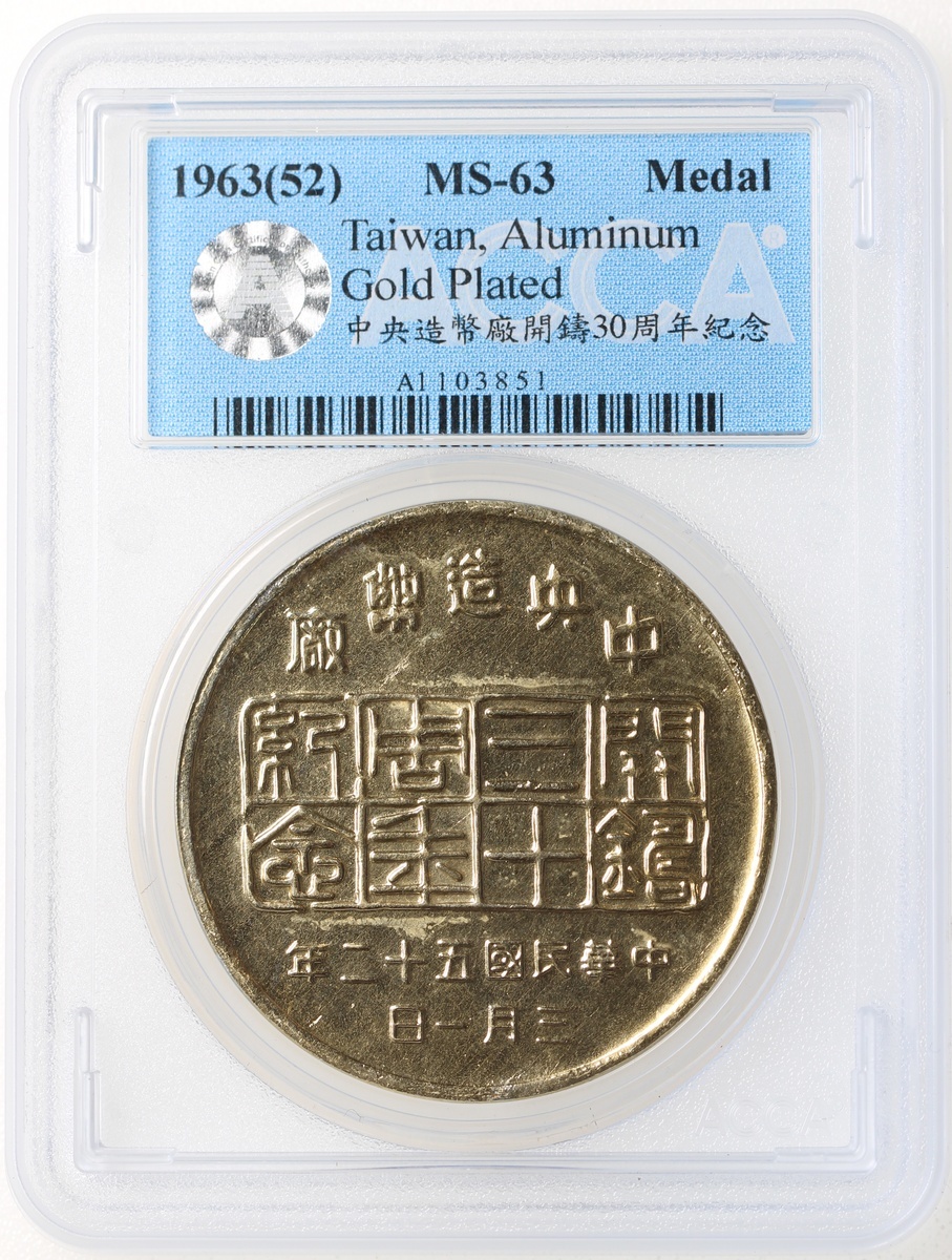 Taiwan, gold plated aluminium medal, 1963, Commemorating the 30th Anniversary of the Central Mint,