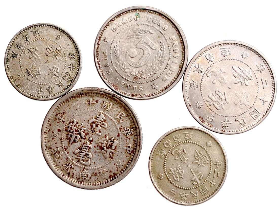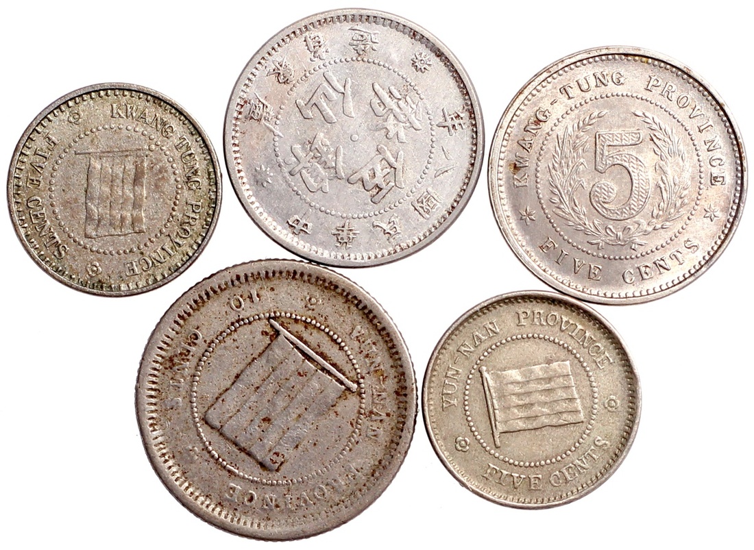 (x) Kwangtung Province, group of 3x nickel 5 cents, 1919, 1921 and 1923, also Yunnan Province nickel 5 and 10 cents, 1923,