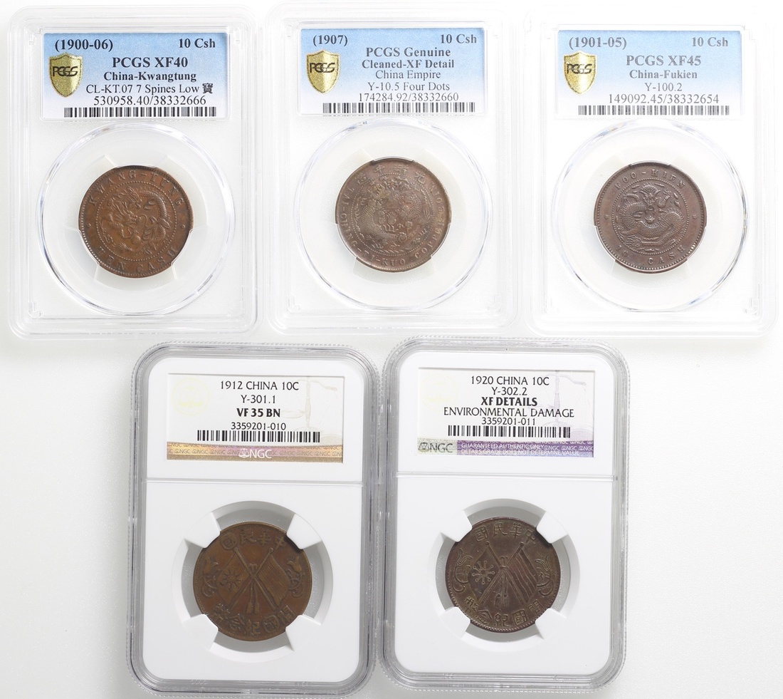 mixed condition, in general fine to about uncirculated, of which three Qing Dynasty 10 cash is graded PCGS XF40, XF45 and Genuine Cleaned - XF Detail, and 2x Republican 10 cents graded VF35BN and XF Details (37)