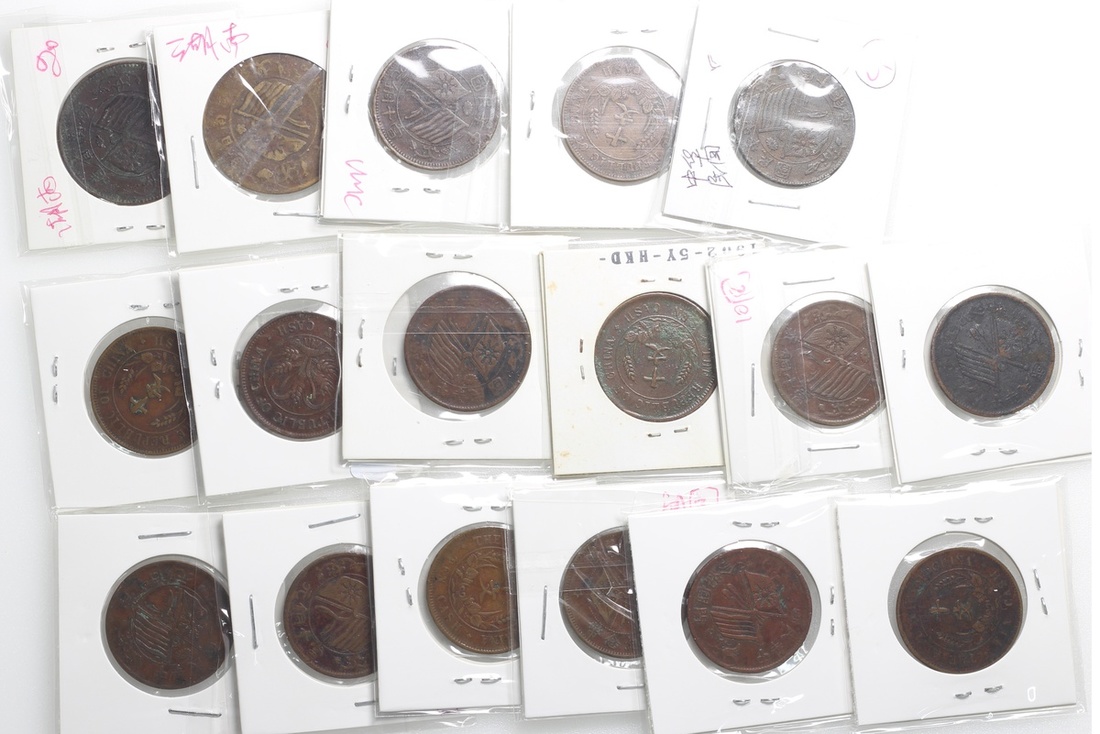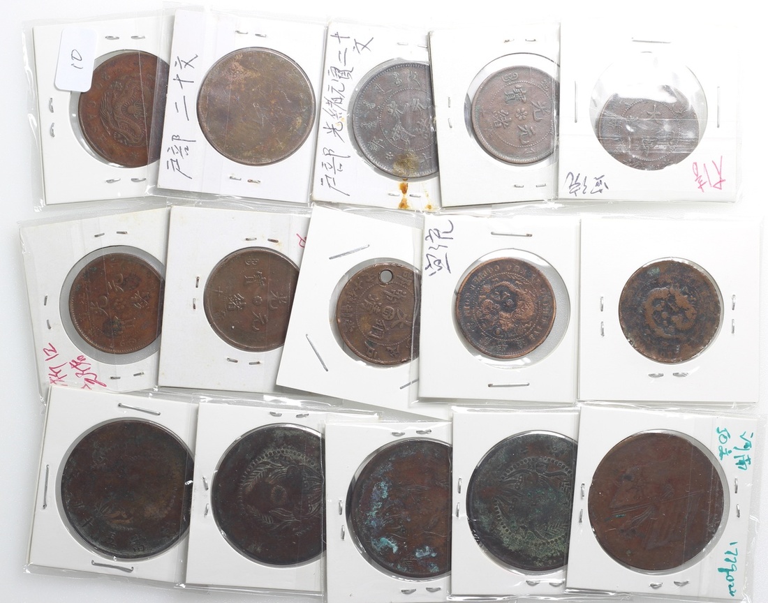 (x) China, group of 37x copper cash coins, consisting of: 13x Qing Dynasty, including 10 cash (10) and 20 cash (3), Guangxu, Xuantong and Empire issues, also 24x Republic of China, including 'Memento' 10 cash coins (17), 20 cash (2) and 50 cash (5),