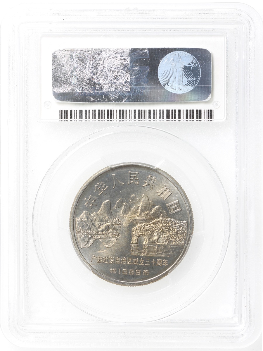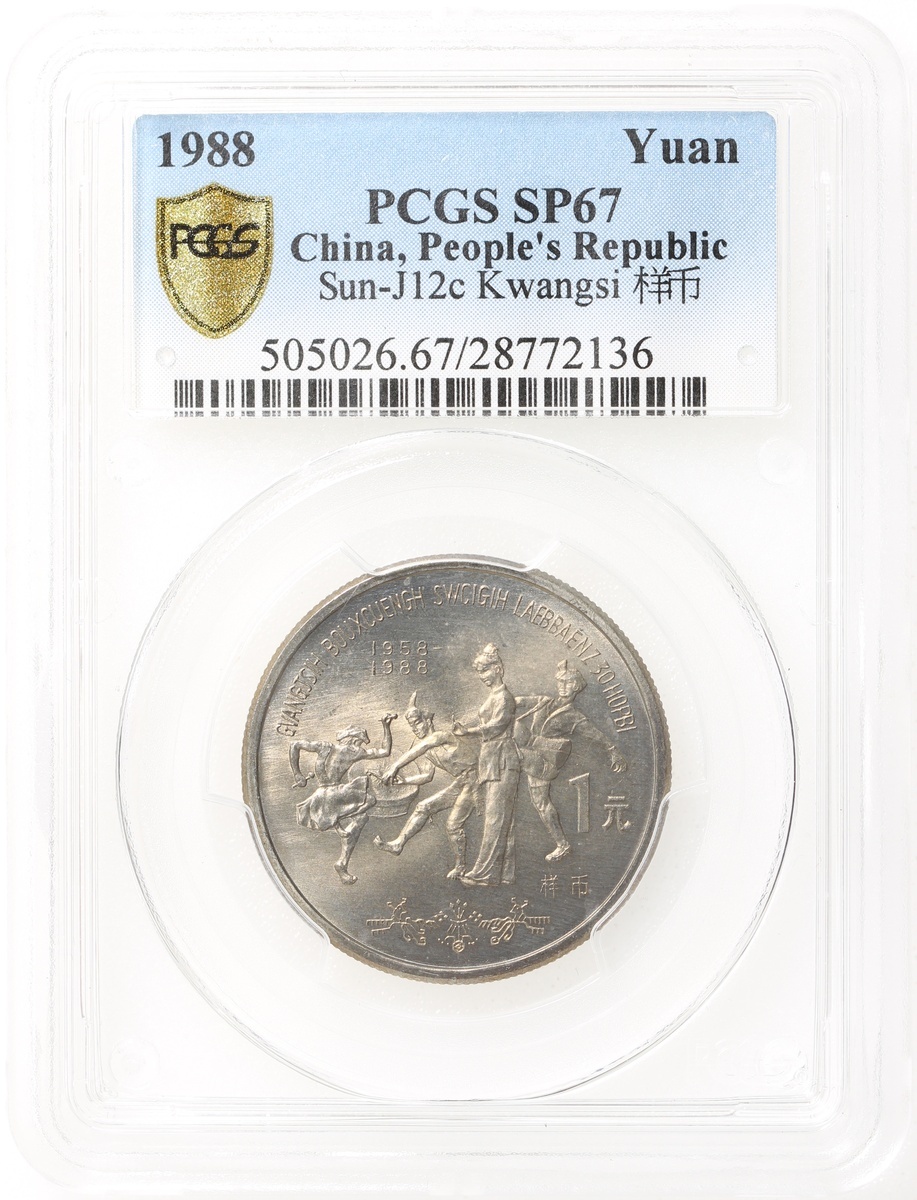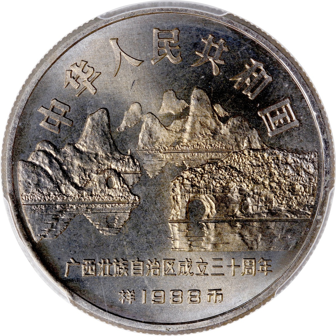 (x) People's Republic of China, nickel 1 yuan, 1988, Pattern, struck for the 30th Anniversary of Guangxi Zhuang Autonomous Region, PCGS SP67, the highest grade in the PCGS population, very rare.