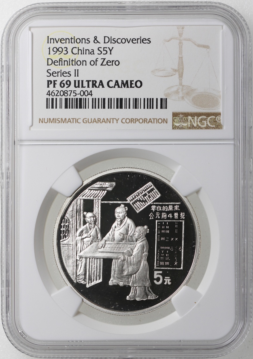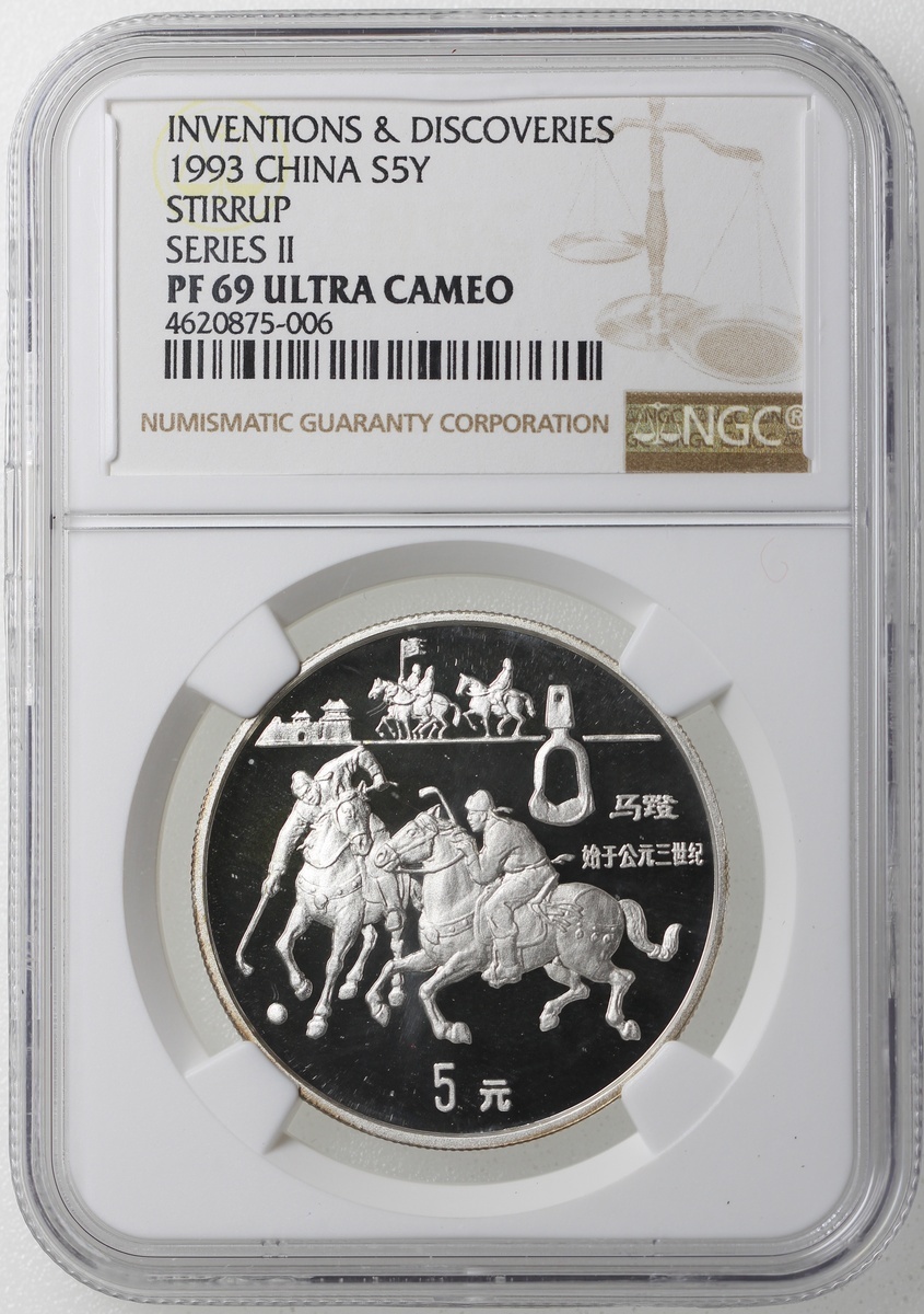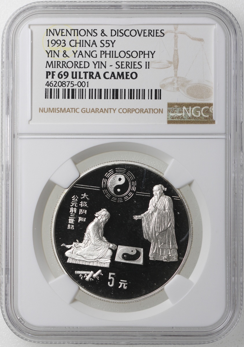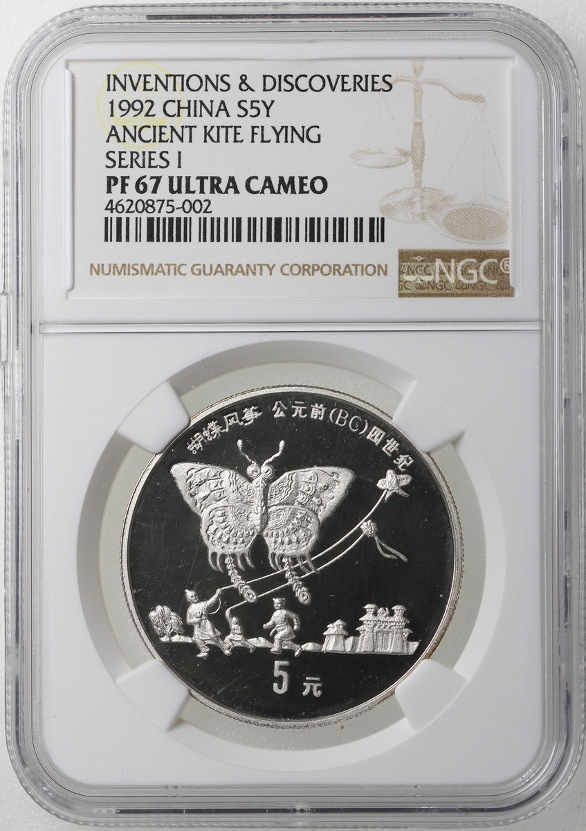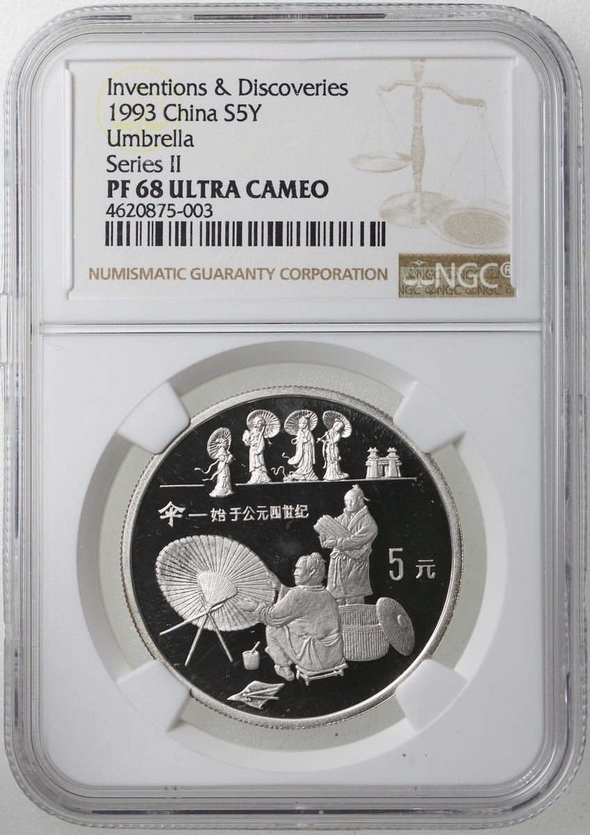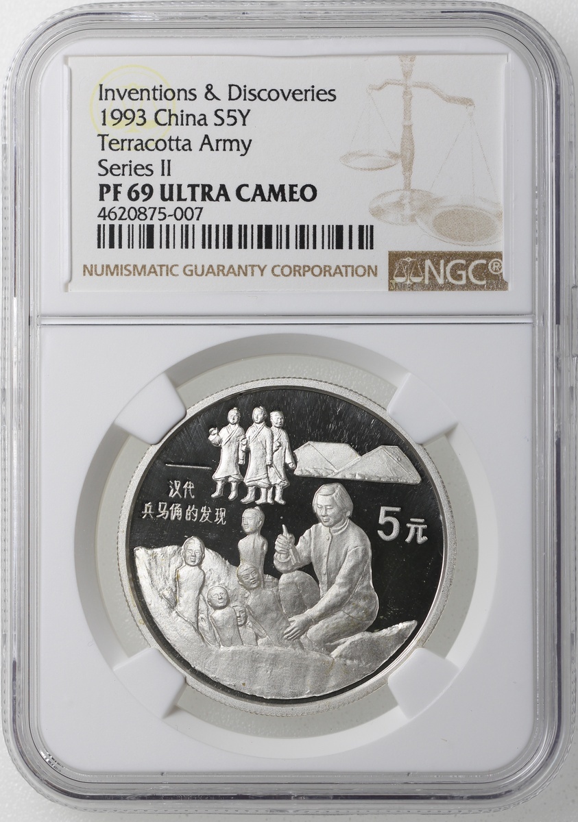 People's Republic of China, silver proof 5 yuan, Inventions and Discoveries Series II, 1993, group of 5, Terracotta Army, Yin and Yang, Stirrup, Definition of Zero and Umbrella, also Series I, Ancient Kite Flying, 1992,