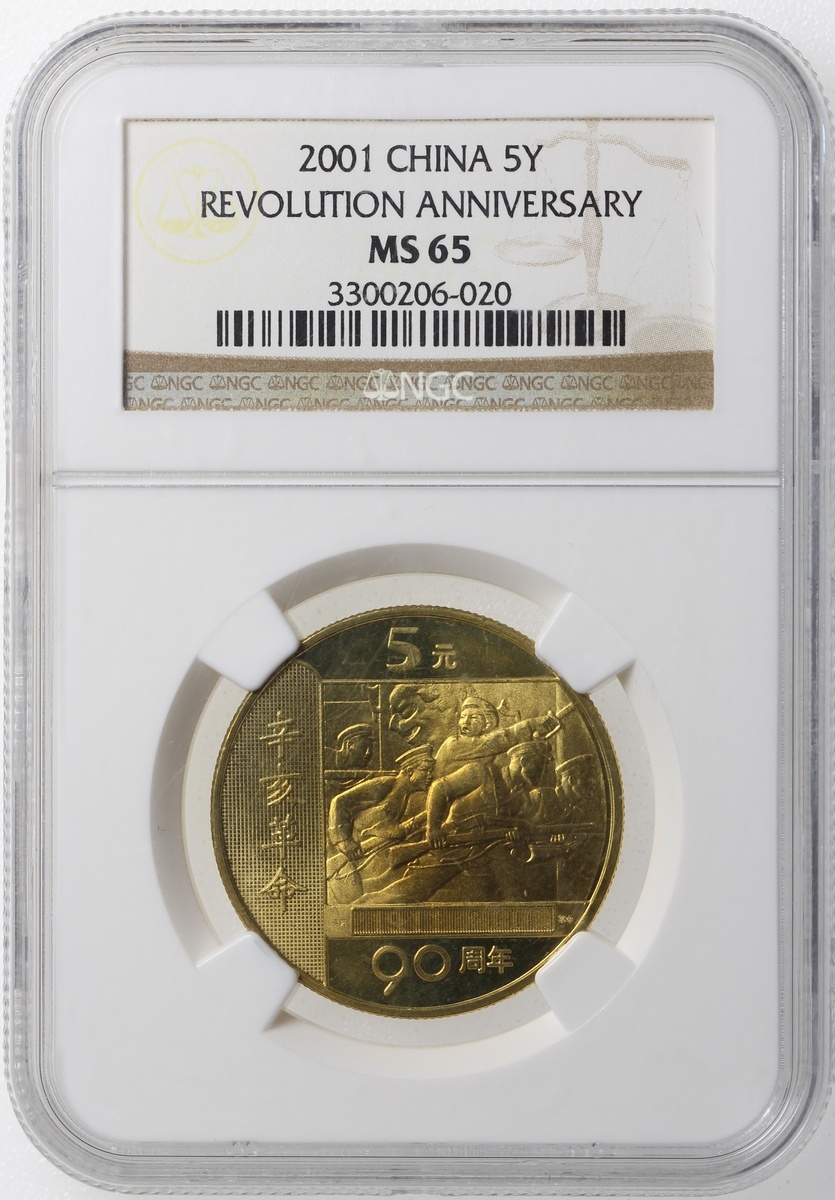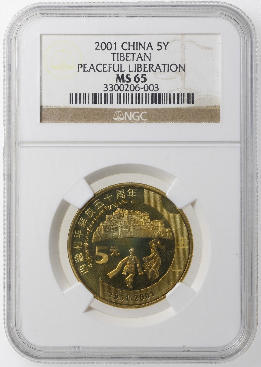 (x) People's Republic of China, a pair of copper 5 yuan, 2001, '50th Anniversary of Tibetan Peaceful Liberation' and 90th Anniversary of Xinhai Revolution', both NGC MS65 (2).