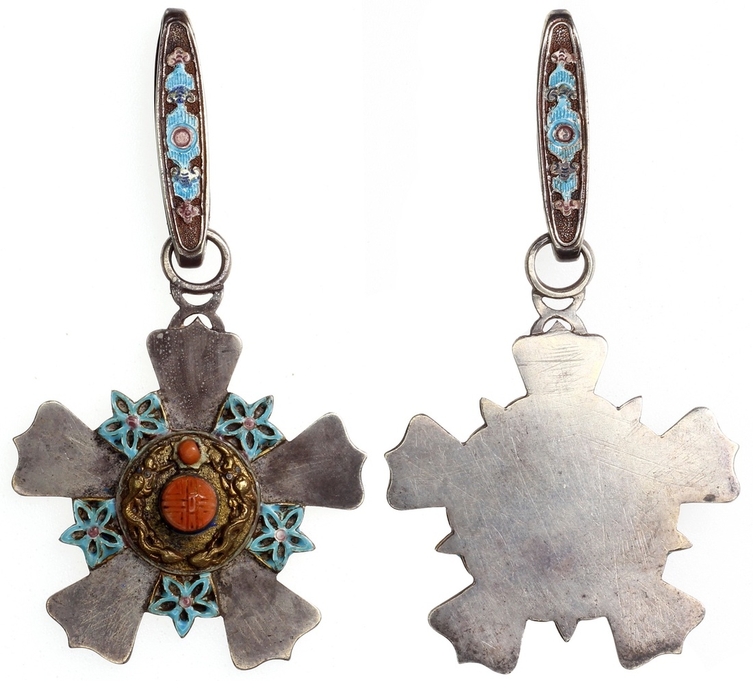 Qing Dynasty, Order of the Double Dragon, Second Class Second Grade, gilt silver star badge, red coral at centre and top, the top small coral bead probably later fixed, very fine and rare.