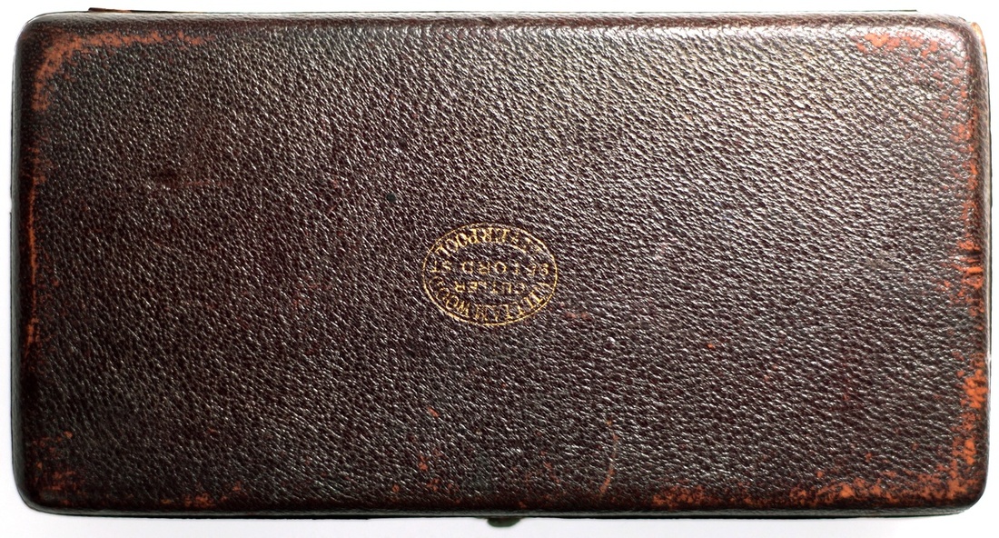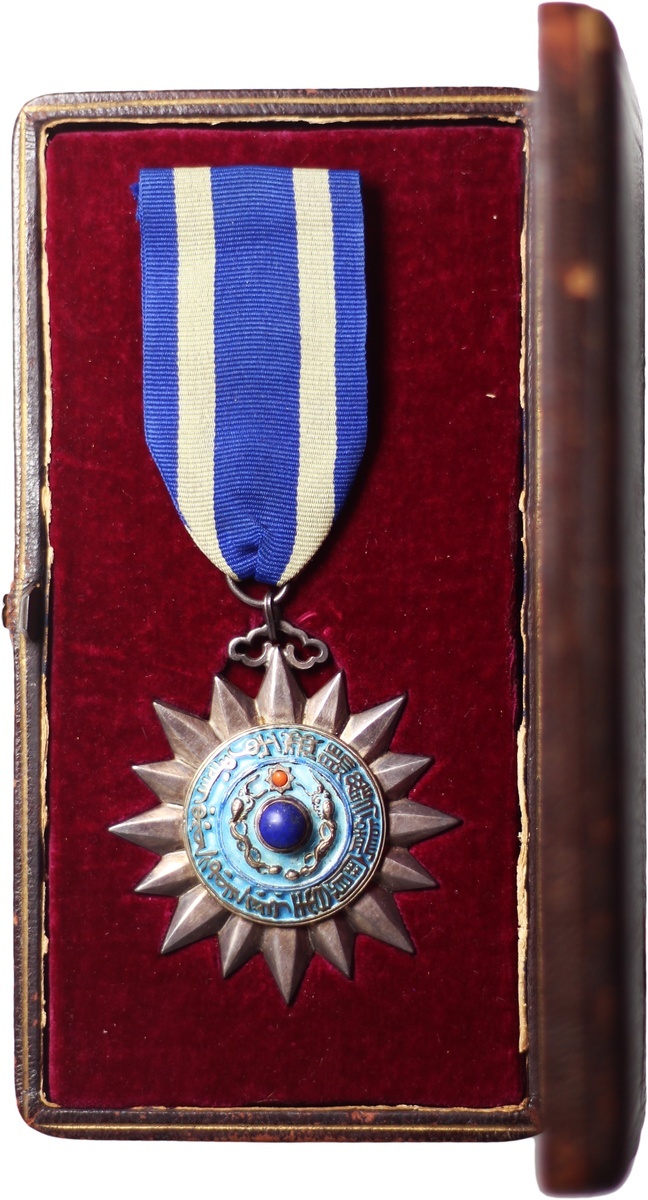 (x) Qing Dynasty, the Order of the Double Dragon, type II, 4th class, silver enameled, blue jewel at centre, coral bead at top, together with a Williamwood Liverpool leather case, the medal with riband, toned, the case damages and wore on surface.