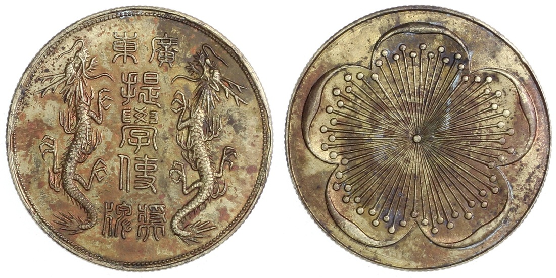 Qing Dynasty, Kwantung Province, a silver merit medal struck by the Kwantung Province Education Commissioner, 1905's, two dragons at left and right, Chinese characters at centre, reverse plum blossom, some toning, almost uncirculated, rare.