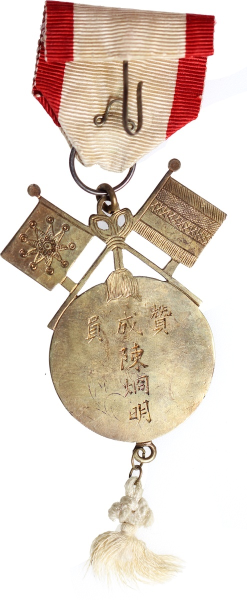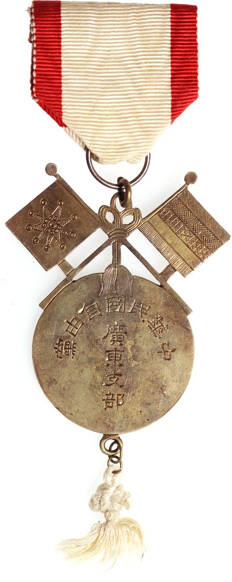 (x) China, Republic, a gold plated badge of the Liberal Party Kwangtung branch, crossed flags at top of the circular shaped badge, Chinese characters on both side, with the name of the general 'Chen Jiong Ming' on reverse, with ribbon, well preserved, rare seen.