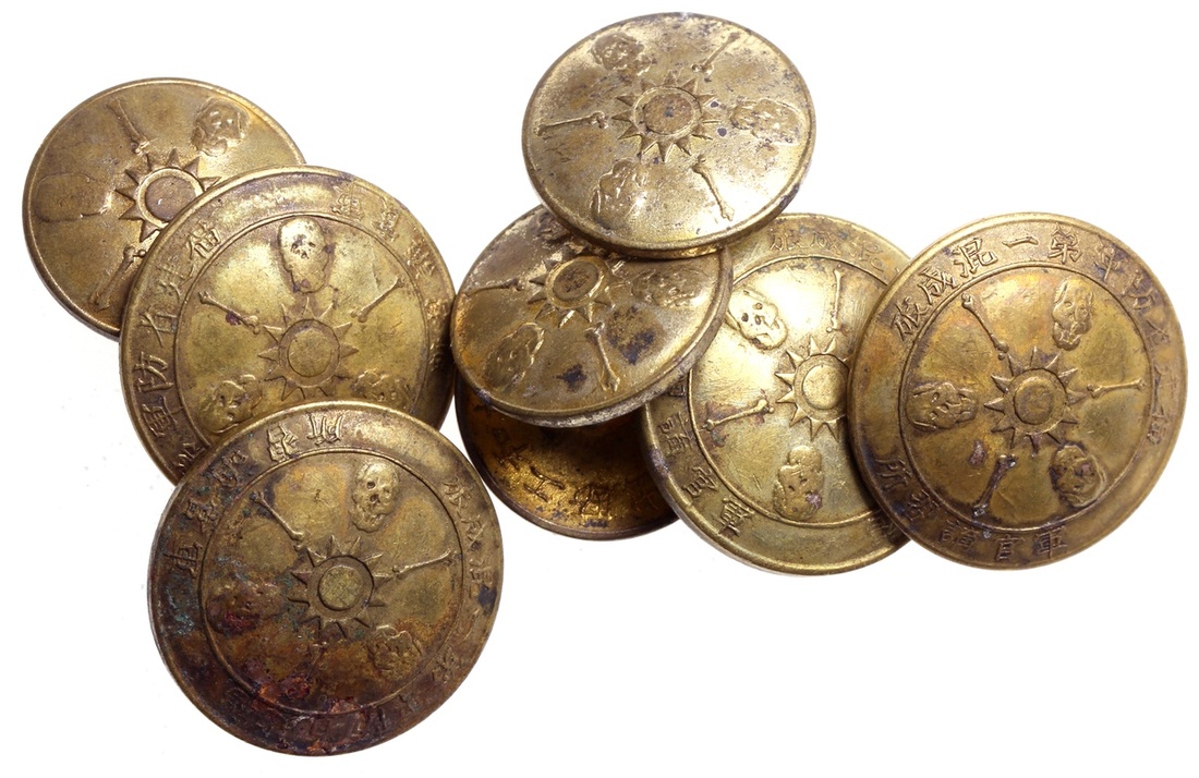 Republican Era, Fukien Province, a lot of military officer uniform's bronze buttons, used for the Officials of the 1st Mixed Brigade of Fukien Province Defense Army, two sized, 4 larger and 4 smaller, good very fine, rare seen.(8)