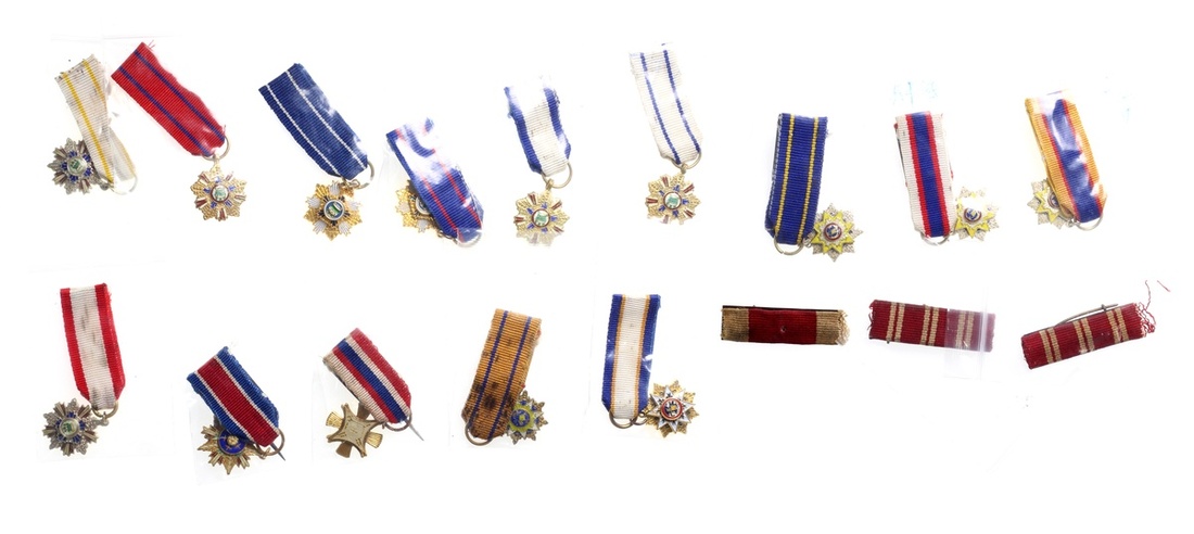 Republican Era, a group of 14x miniature orders and 3x medal bars, consisting of the Order of Precious Tripod(7), Order of Resplendent Banner(5), Air Force Order of Book of Nature(1), Air Force Order of Rejuvenation(1), medal bar for the Huazhou Medal(1) and others(2), various grades, some later issues, medal bars and a few miniature's ribands with stains or worn, others very fine to good extremely fine. Sold as seen, no return(17)