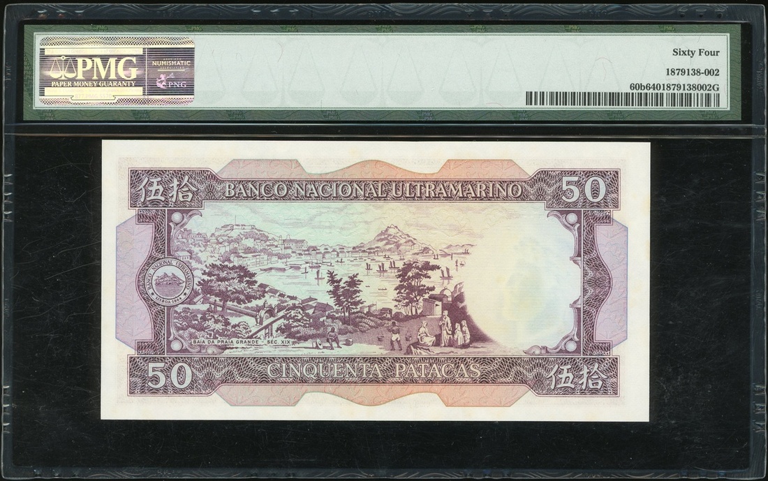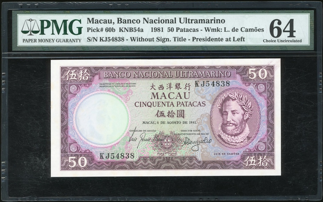 (x) Macau: Banco Nacional Ultramarino, 50 Patacas, 8.8.1981, serial number KJ54838, without signature title 'Presidente' at left,